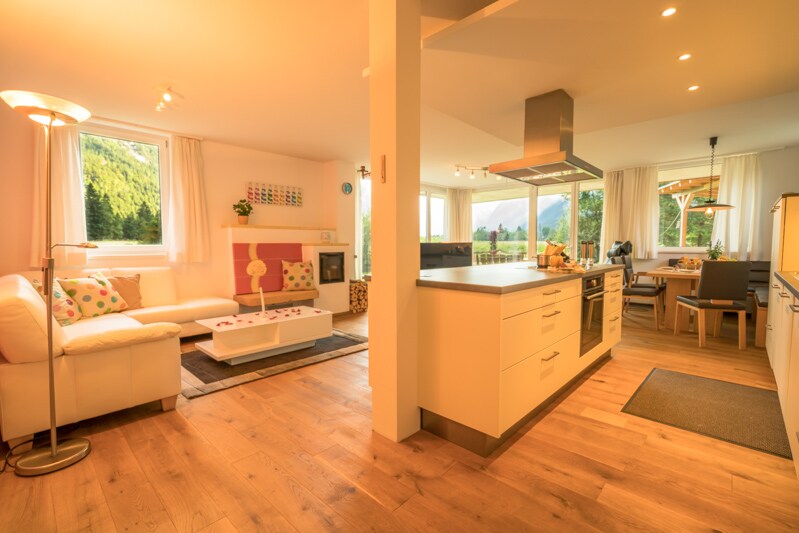 Deep sleep, fresh air and magnificent views. 90 sqm, on the upper floor, 1 bedroom, 1 bathroom with underfloor heating, open kitchen with living and dining area, fitness/wellness room with infrared cabin, suitable for allergy sufferers, large balcony with magnificent Zugspitze view, car parking space at the house, Wi-Fi, flat-screen TV, bed linen + towels, hairdryer, daily soap, occupancy 1-2 people. No pets allowed in this neighborhood.