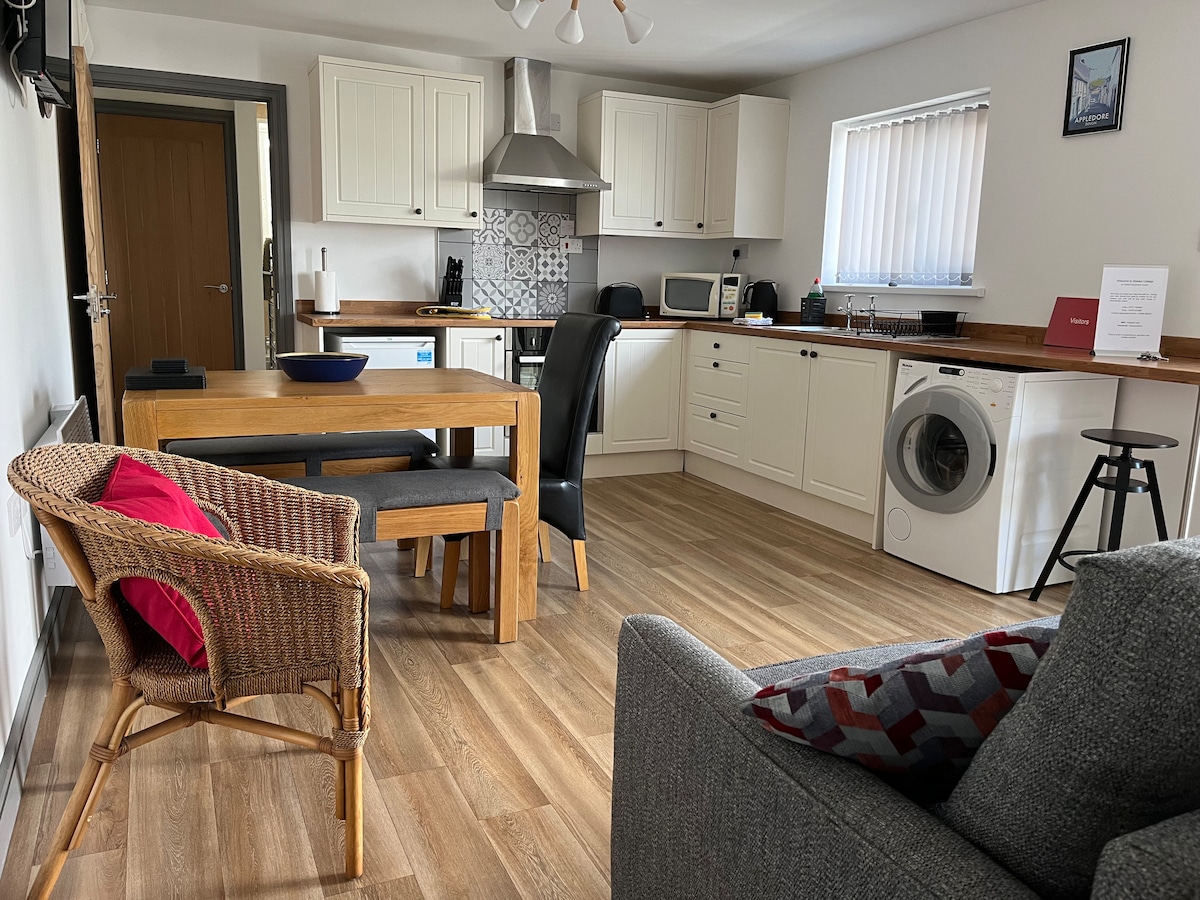 Escape the chaos of everyday life and chill out in our romantic retreat for two. It's in an AONB along the North Devon coast and set in its own private garden behind a picket fence, with ample parking. Beautifully finished in oak and tastefully furnished. Lovely underfloor heating, a woodburner, cosy sofa in the snug area and a super comfy king-sized bed. Only a 30 second walk for the most amazing views & sunsets over Lundy Island or enjoy a glass of wine under the stars around the fire pit…