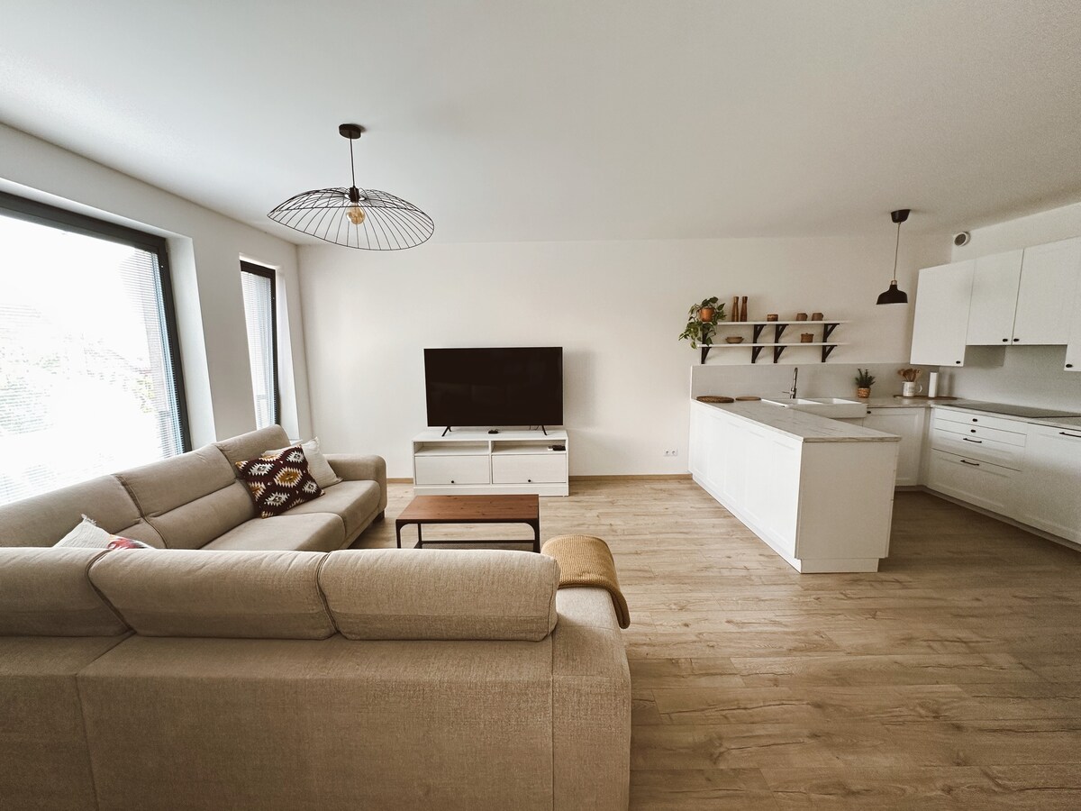 2-room apartment with a loggia on the 1st floor without an elevator, near the center (15 min walk), fully furnished, nearby tennis courts, volleyball and sports fields, pump track, swimming pool, forest park, restaurant, pubs, bicycle rental available on request. Parking is charged in front of the apartment building 8€/day, in the adjacent streets free of charge.