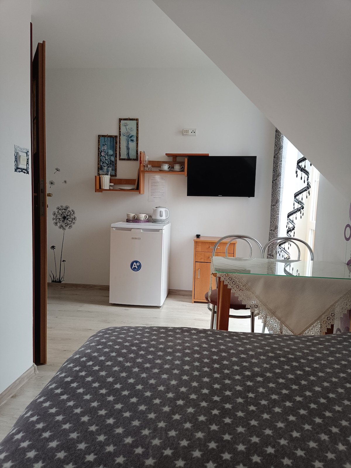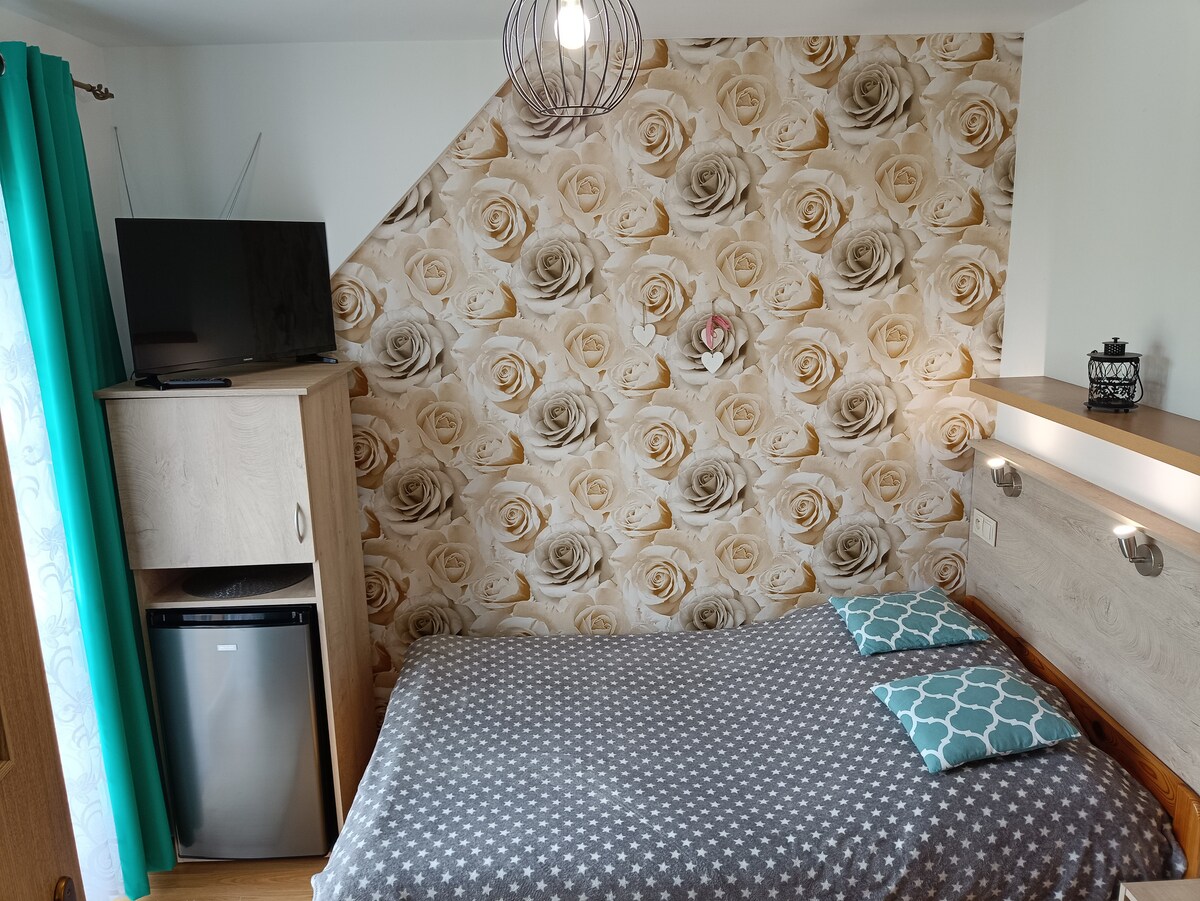 Przytulny apartament typu studio na parterze dwupoziomowego domku wypoczynkowego w bliskiej odległości od Jeziora Solińskiego. Jednoprzestrzenne wnętrze łączy w sobie salon, jadalnię i w pełni wyposażoną kuchnię. Znajdziesz tu trzy rozkładane sofy, łazienkę z prysznicem oraz urokliwy kominek typu koza, który tworzy wyjątkowy klimat. Duże panoramiczne okno zapewnia piękne widoki i naturalne światło. Idealne miejsce na komfortowy wypoczynek w domowej atmosferze.