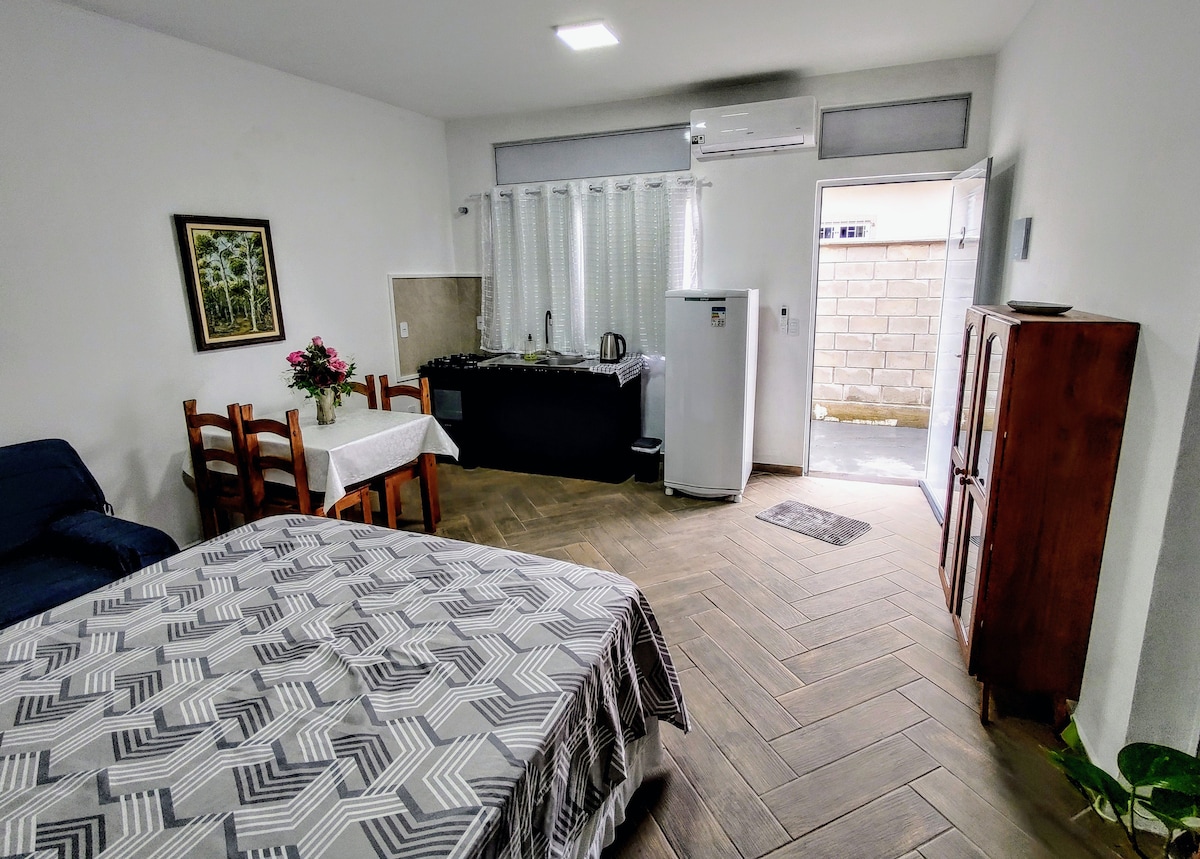 Cozy studio in Serraria, São José. Large, well-lit and equipped with a double bed, refrigerator and dining table. Central location and easy access, with a market next door, a pharmacy nearby and several shops in the region. Ideal for those seeking practicality and comfort in a short or long stay, whether for business or leisure.