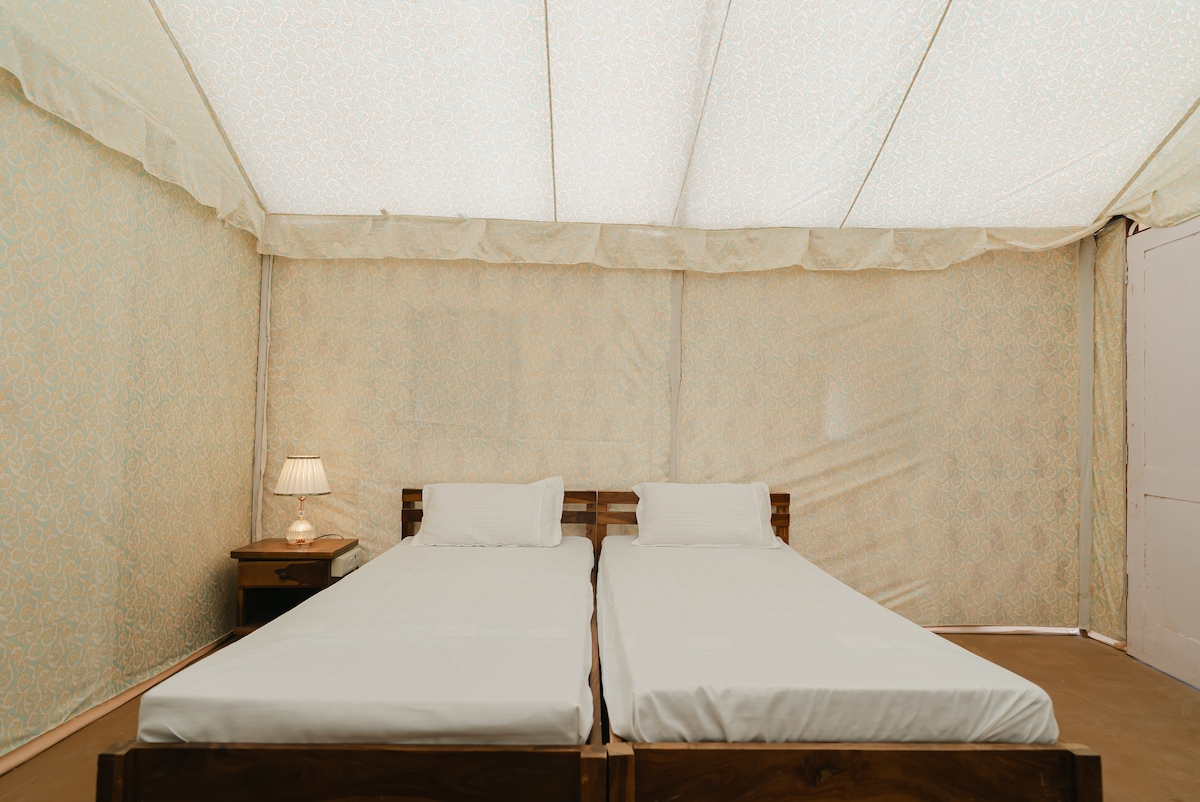 All open place surrounded by sand dunes, desert bushes, trees , temples very close is Camel breeding farm and city too. No one in the immediate neighbourhood. And is very SAFE for anyone to stay. Sometimes we get to see blue bulls, Camels, Sheep/Cattle herders for grazing. And city could be viewed.
