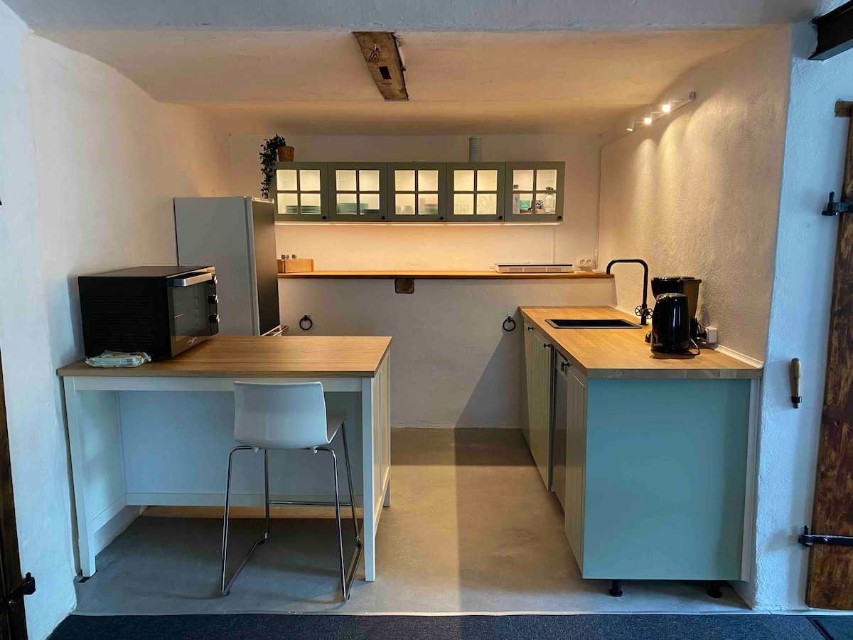 Du får din egen indgang til lejligheden. Fra soveværelset indgang til TV stue / tekøkken med mulighed for opredning til 2 personer på sovesofa. Fra TV stuen er der indgang til eget bad / toilet. Der vil være mulighed for at opbevare ting i køleskab med lille fryser. Der er el kedel så man kan lave kaffe og te. I tekøkkenet findes 1 mobil kogeplade og 2 små gryder samt 1 ovn Der må ikke steges i rummet. Kolde drikkevarer kan købes for 5 kr. og vin 35 kr. Betales kontant eller MobilePay.