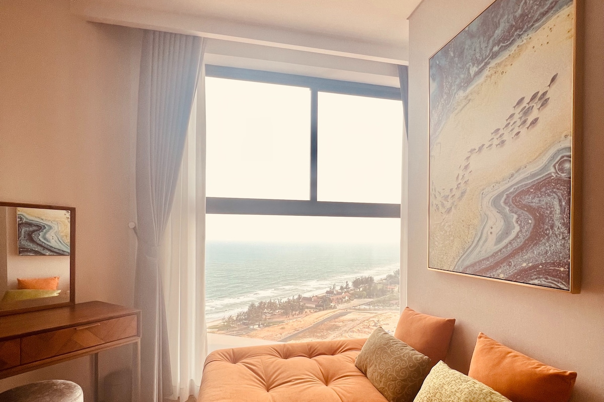 Inspired by Tibetan Buddhist architecture, the interior of the apartment is warm red combined with the wheel of the dharma and the Lungta flag flying in the wind... The harmony throughout the interior creates an apartment that is both mystical and full of free and liberal emotions. No need to move, you can watch the sunrise right in bed. You can also sip a cup of tea by the window, admire the most beautiful coastal sand road in Vietnam, and watch the immense blue sea and white sand stretching.