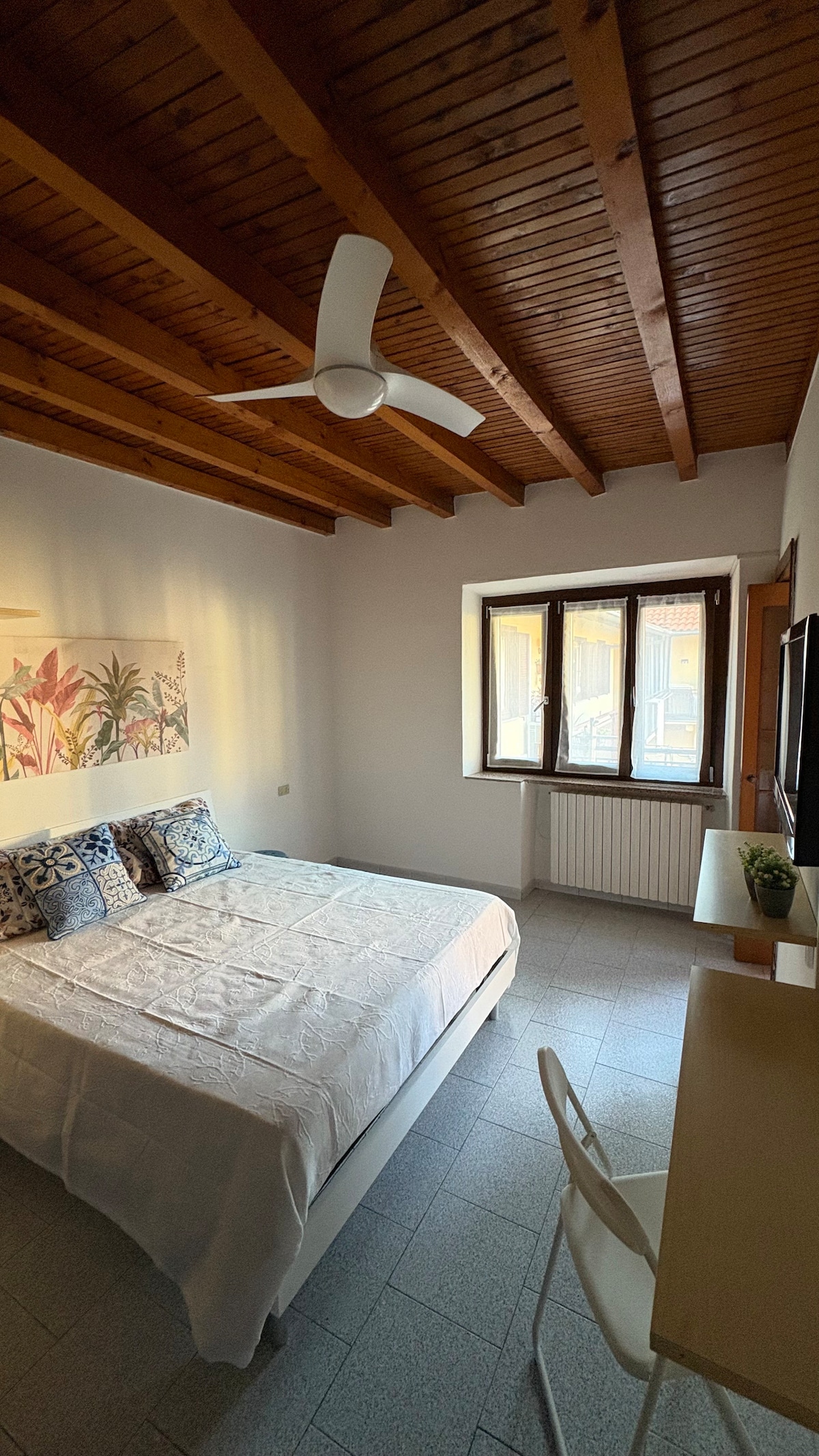 The Guest Suite is an intimate attic with parquet floors and exposed sloping beams that create a warm and cozy atmosphere. The bathroom, with a double shower and suspended sanitary fixtures, offers high-quality comfort and design. Air conditioning and heating ensure a pleasant stay in any season. The parking under the house is spacious, public, and free. Thanks to the nearby highway, Malpensa Airport and the cities of Como and Milan can be reached in just 30 minutes.