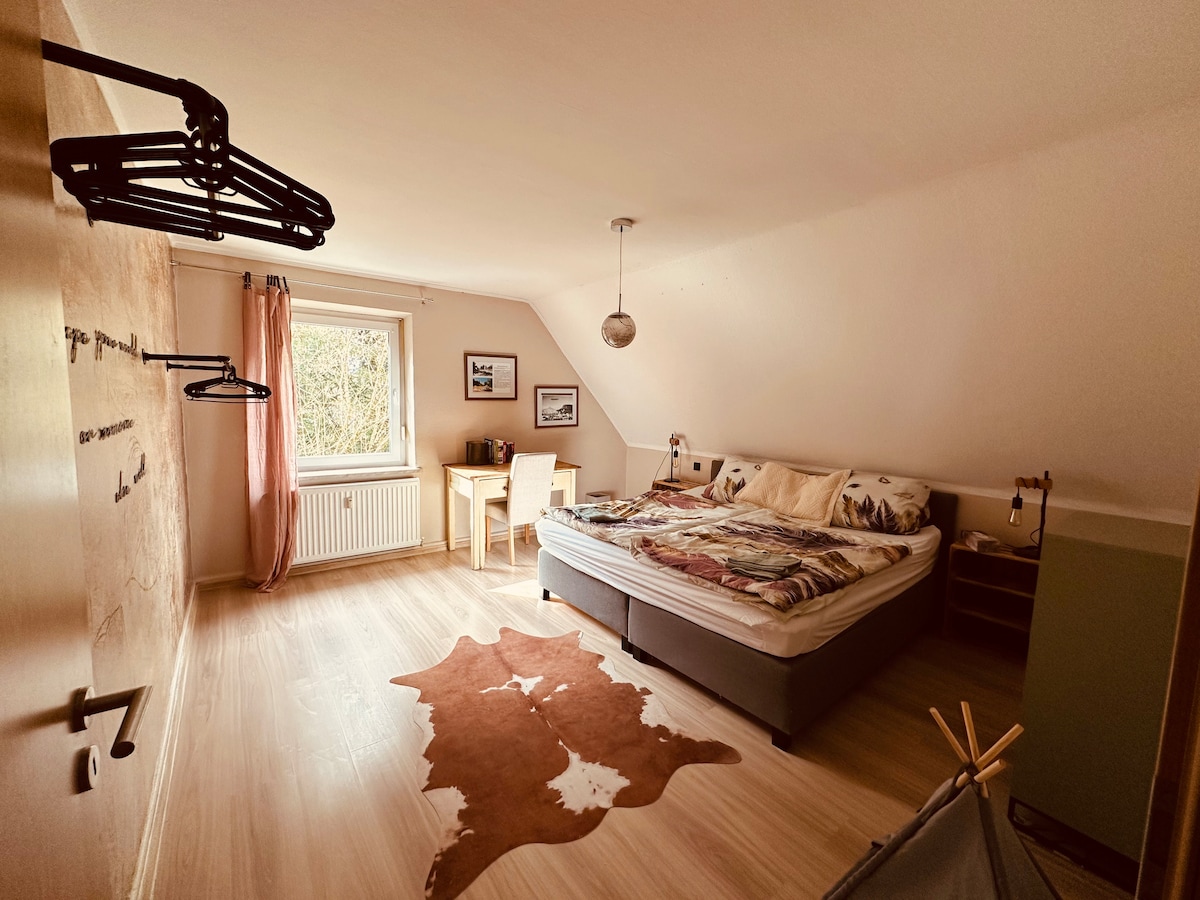 In the heart of the Volcanic Eifel, between the two small towns of Gerolstein and Prüm, lies our cozy apartment. Our apartment can accommodate up to 6 adults on a total area of about 90 square meters. Two bedrooms, a modern bathroom, a light-flooded living room and a spacious kitchen-living room invite you to socialize. From here, the Eifel tourist region and its many attractions can be best explored. We are happy to share our best tips with you!