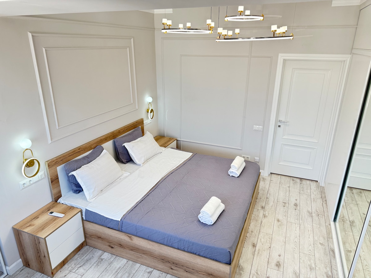 Cozy, Luxury Apartment for a comfortable stay in the freshly made Elite House located in the city center. The house is striking both day and night. At night, the building shines very beautifully, can be seen even from a long distance. On the ground floor of the building, there is a 24/7 supermarket & pharmacy, GYM, beauty salons, bank. The apartment is very bright and comfortable with all amenities. The building is safe and guarded around the clock, there is also a playground on the territory.