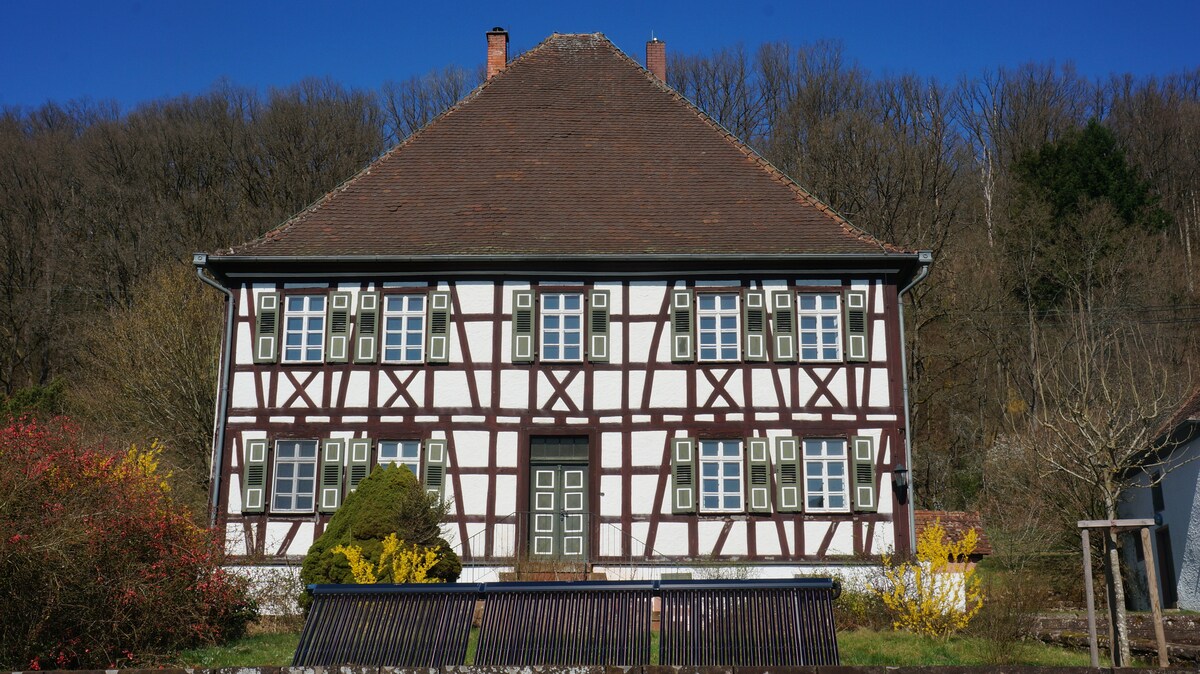 You will have sole occupancy in the Former Landgrave's Hunting Lodge in Eppenbrunn, a remarkably beautiful half-timbered building from 1742 in a 4415 m² park with wooded area, BBQ, and terrace. The villa offers a luxurious kitchen, spacious, light-filled living, dining, and sleeping areas, comfortable bathrooms, a playroom with a library, and a billiard room. In the outbuilding is space for your bicycles. This true holiday residence has received exclusively 5-star overall ratings since 9/2024.