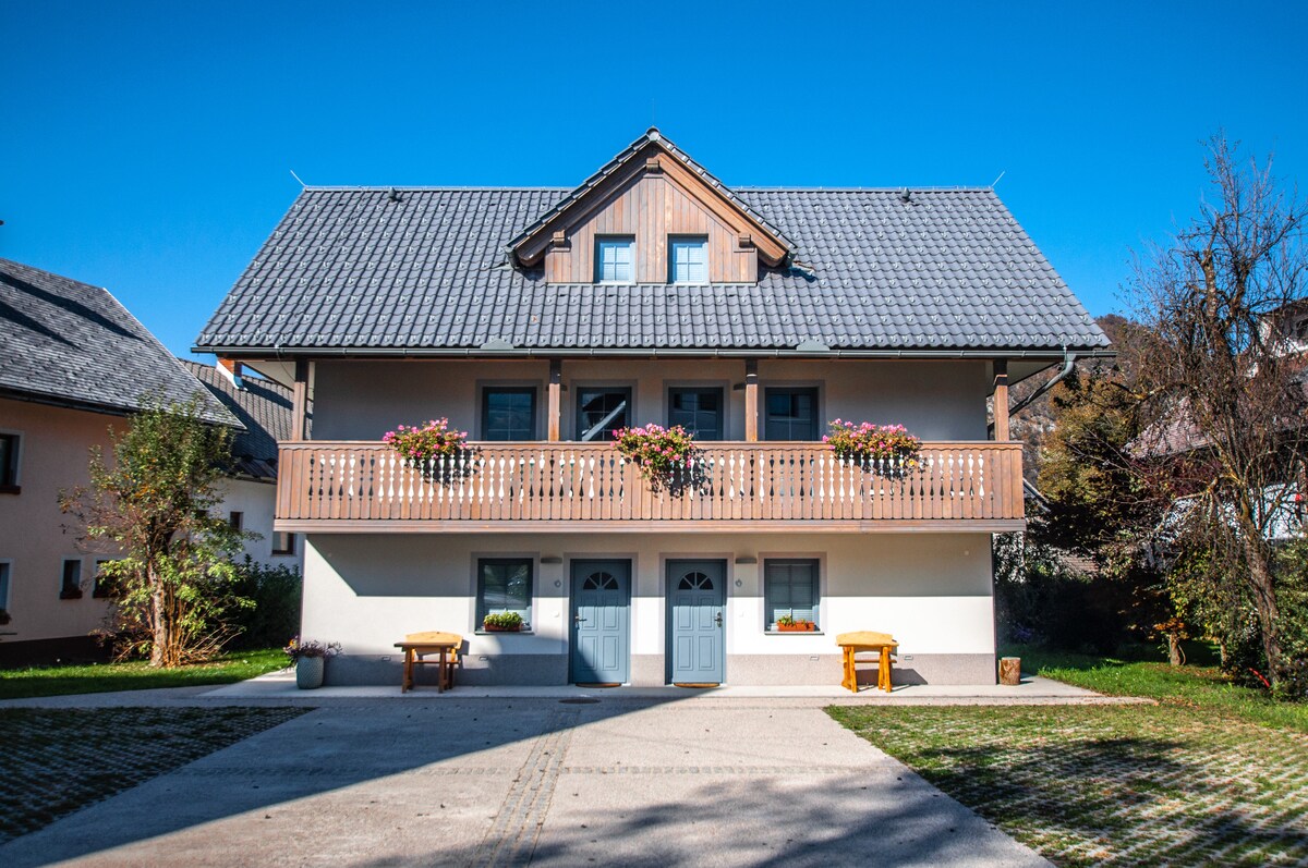Bright apartment- loft with a great view of the mountains, just a few minutes from lake Bohinj. Black and white with something red - like a cake with a cherry on top :) You'll feel at home and at the same time you’ll be on holidays. Location offers many hiking and bicycle paths and it is close to the ski resorts of Vogel and Soriska planina and a Water park with wellness and only a few kilometres from lake Bohinj, where you can swim, surf, kayak, sup,..., and enjoy the nature.