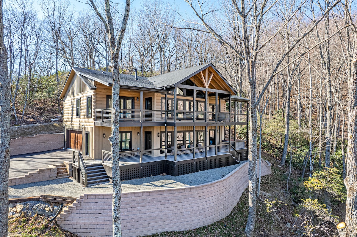 Escape to this serene, spacious mountain top retreat with breathtaking lake and mountain views. This custom luxury log home features 4 BRs, 4 full baths, a loft, office space, large entertainment area, 3 porches, and a pickleball mini court. Enjoy the cool mountain air and unwind in the luxury hot tub, gather around the firepit, or challenge each other with a game of Ping-Pong or poker. A short drive to Asheville, Lake Lure, and Brevard with access to outdoor activities, music, and restaurants.