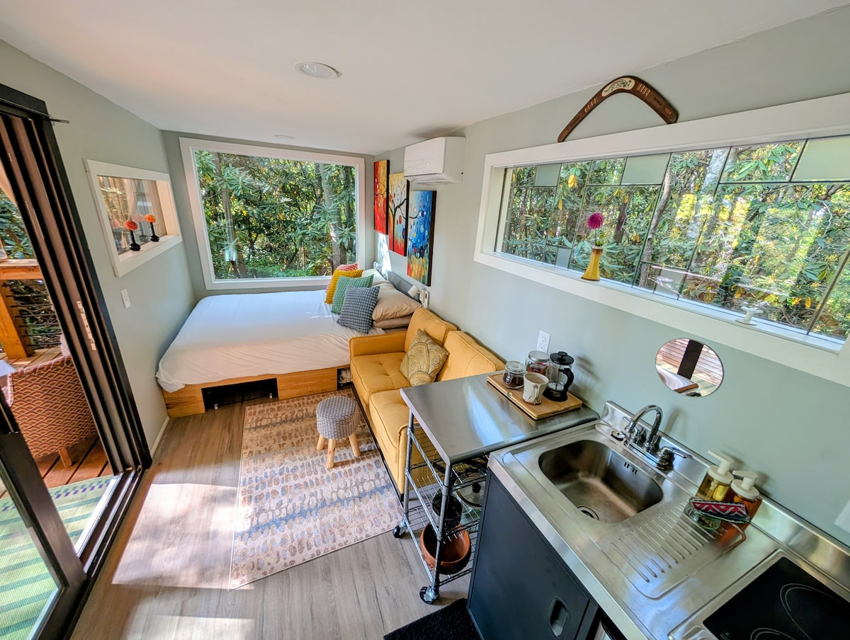 This new modern container home is nestled in a rhododendron forest surrounded by five acres of old growth trees. With long range views (mostly in the winter) and a secluded feel, this oasis is located 8 minutes from downtown Black Mountain and less than 25 from Asheville. Local breweries and music venues, restaurants, hiking trails, and swimming holes await, and all the forest bathing you could ever need. Please read the other descriptions to get a better understanding about us and our property