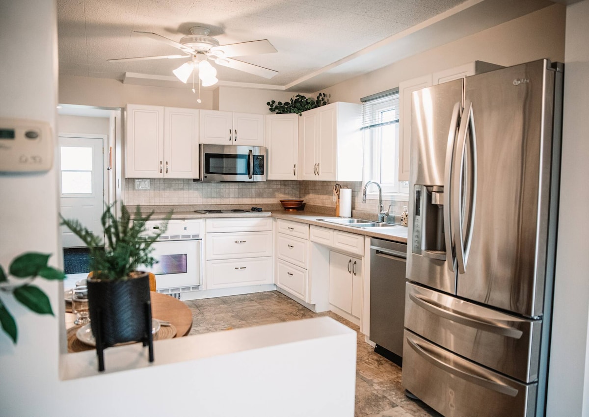 This 2 bedroom home is set up to be a home away from home whether you're on a work trip or a personal vacation. It is close to restaurants, fast food, grocery stores and other stores and close to a very popular walking trail. The fire pit and backyard patio are buried under snow in the winter months. The listing says not suitable for infants and children because there’s stairs but children are welcome.