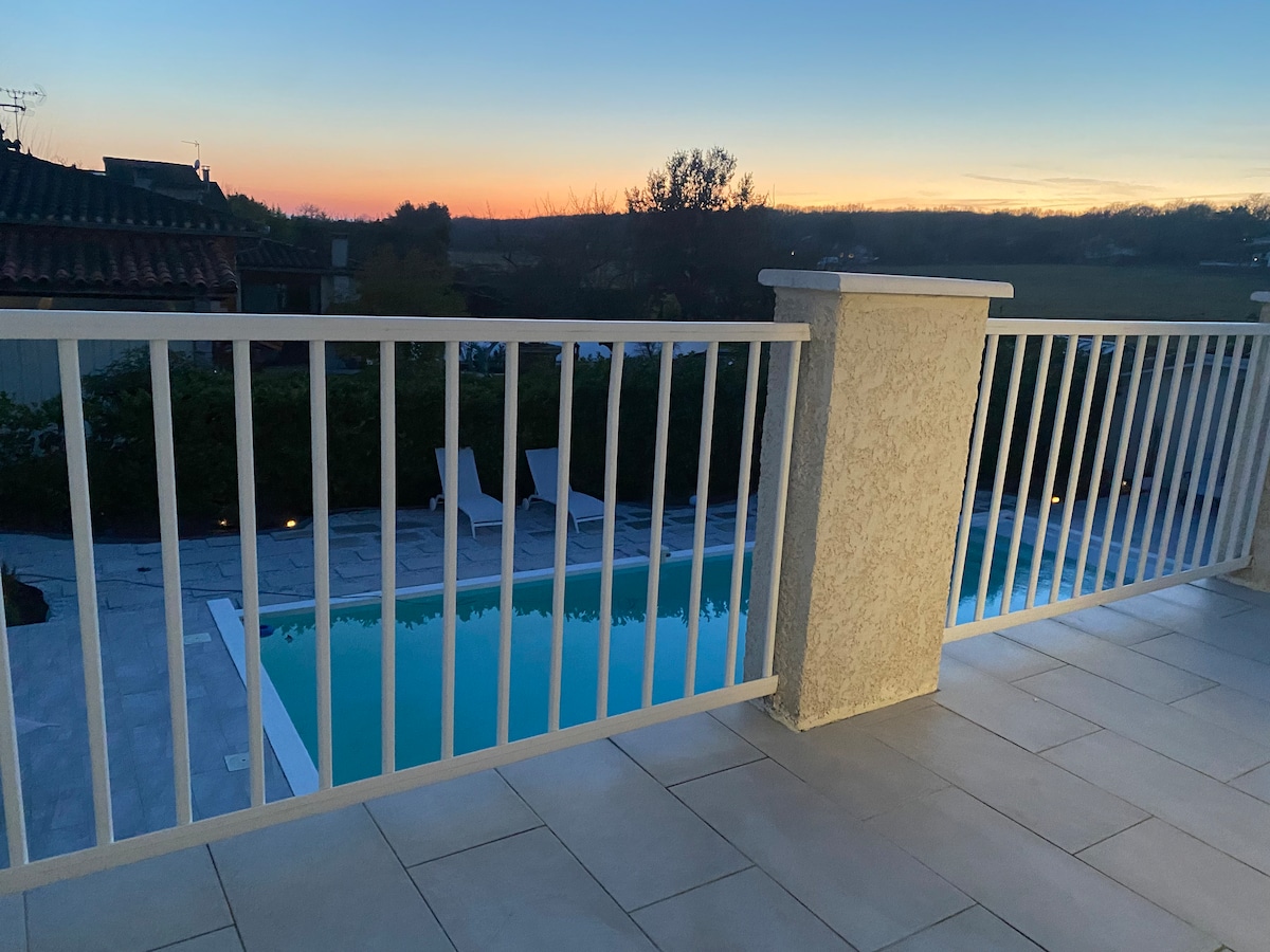 Beautiful house with pool & jacuzzi located north of Toulouse, with big deck made of exotic wood, dominating a private lake. The house is surrounded with wide wooded garden (2500m2) A secured parking lot (100m2) is accessible for the guest. The access is a private road, common with 3 other houses. It is very quiet with no direct view on Neighbors. Fabrice & Sophie will be happy to share with their little paradise. The Jacuzzi is optional please contact us.