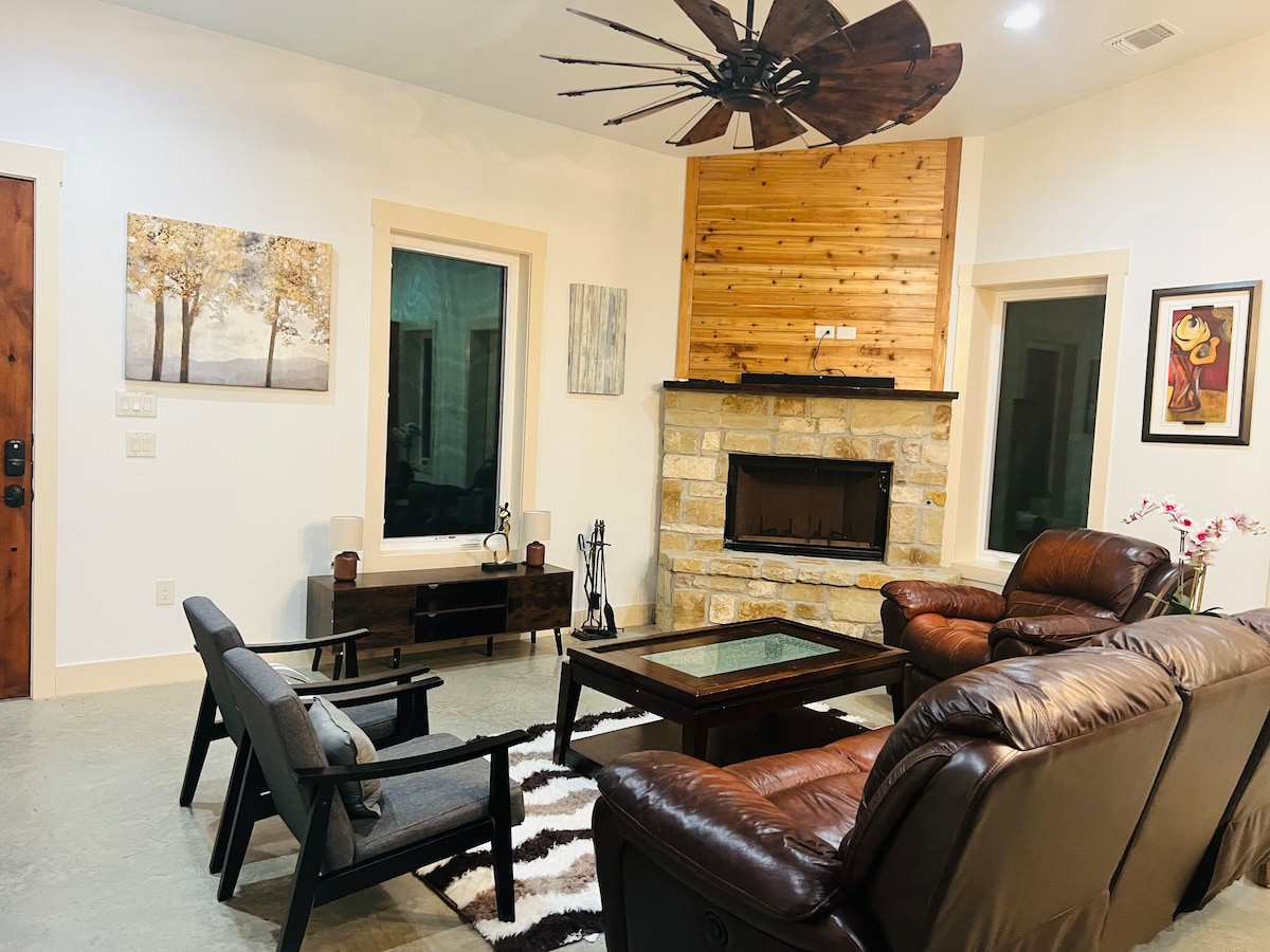 Whether its a romantic get away for two, or fun with the family, this is it. Off a dirt road, private quiet setting. Beautiful country roads, invites cycling or a scenic drive thru the countryside. Huge deck with BBQ and firepit. Starlink high speed internet, Roku TV, log into your favorite streaming apps. 3 bedroom, 2 bath with sofa sleeper. Optional Game Room with Arcade games and golf simulator (separate rental fee applies). 20 minutes to downtown Wimberley, Blanco, or Dripping Springs.