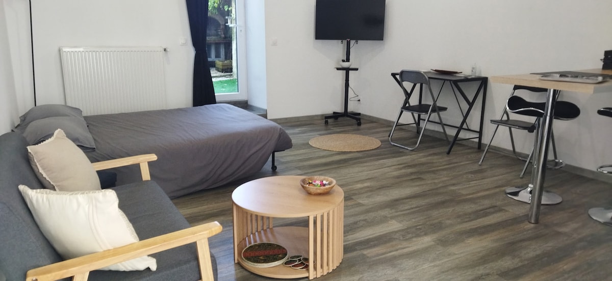 Independent and elegant 48 m² studio in a detached house, accommodating 2 people. It is equipped with a kitchenette, bedroom, office area, sitting area with TV and separate bathroom and toilet (baby cot and armchair on request). A relaxation area to discover ;) Bath towels and bed linen are included in the price. The accommodation also has a courtyard for parking and a private garden (garden table, ping pong table).