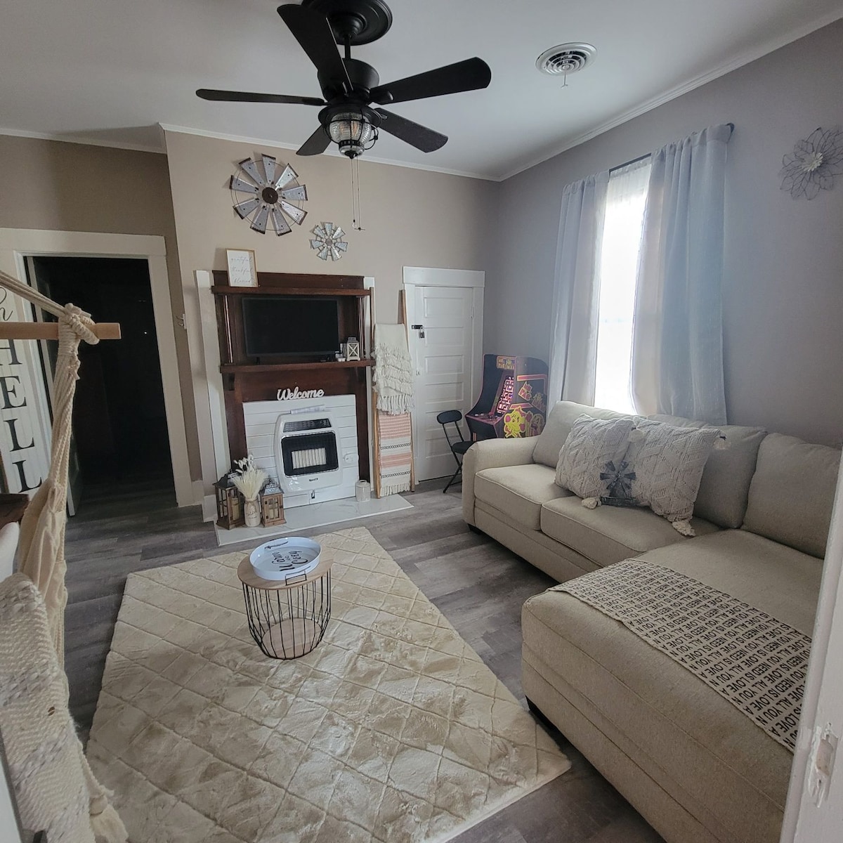Enjoy a stylish experience with some new and older kept features that Rustic Charm has to offers in this centrally located place. Rustic Charm is sure to make any stay fun, comfy, &cozy. 1 bd rm with a king size bed, a closet, & a safe to store your personal belongings. The living room offers an Indoor hammock chair (350 lb wt limit) that you can relax in after a long day. 2 smart tvs with high speed internet and streaming services available. Year round electric fireplace in the bedroom.
