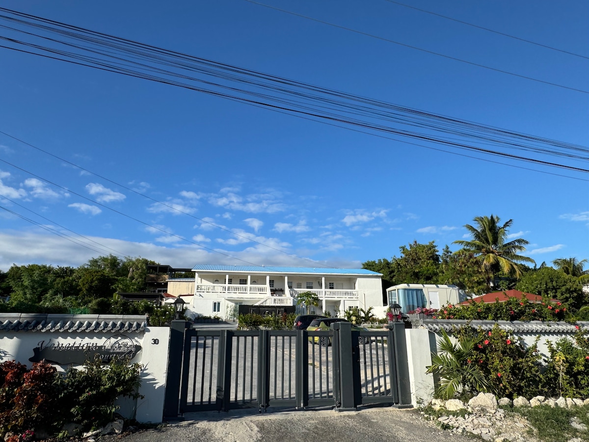Peaceful Palm Trees with a peek of Ocean View! 10 min walk to the beach or 10 min drive to Grace Bay. Located on 2nd floor of the higher buildings, this condo is a spacious studio with Queen Bed, full kitchen, living room, bathroom, washer and dryer, Wifi and free parking. The large balcony has a pretty view over soothing palm trees dancing in the breeze, with a peek at the ocean in the distance. A great place for morning coffee or relax after long day at the beach or by the pool.