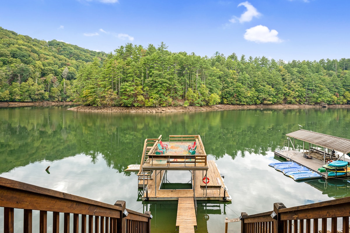 Enjoy lake and mountain views in this updated oasis amongst the trees. Whether you're looking for an outdoor adventure or a rejuvenating escape, we have it all! Situated on a five acre lake, enjoy the private dock and use of our two paddle boards and canoe. After a day of hiking, decompress in the hot tub and sauna. Tons of space to gather both indoors and outdoors, we hope you'll enjoy all the modern amenities while reconnecting with nature. Just 12 minutes to downtown Ellijay!
