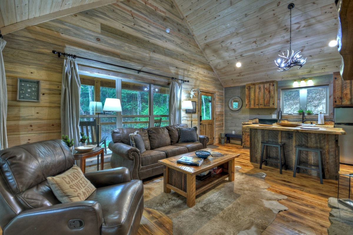 Relax in this peaceful and private modern space. A quick drive from the city and you've arrived at this escape from the hustle and bustle. Yet when the mood strikes for great restaurants, trendy bars/breweries, and unique small-town shopping you're only minutes away from downtown Blue Ridge. In this completely updated cabin you'll experience total privacy in the indoor hot tub, gorgeous screened in porch with swing bed and tv, huge walk-in shower, serene firepit, new grill & firepit table.