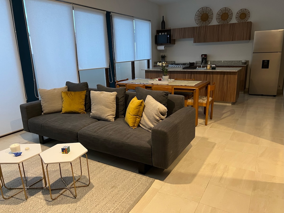 Newly remodeled apartment, fully furnished with all amenities. A huge bedroom with a king-size bed, a living room with a comfortable double sofa bed, a granite bar for eating, a kitchenette with everything you need for cooking, Wi-Fi, a smart TV with a Netflix account for exclusive use. Complimentary coffee, tea, and bottled water. Super location 5 minutes from Plaza Américas, Plaza Andamar and Plaza Vela. A 15-minute walk to the coastal area of Boca del Río.