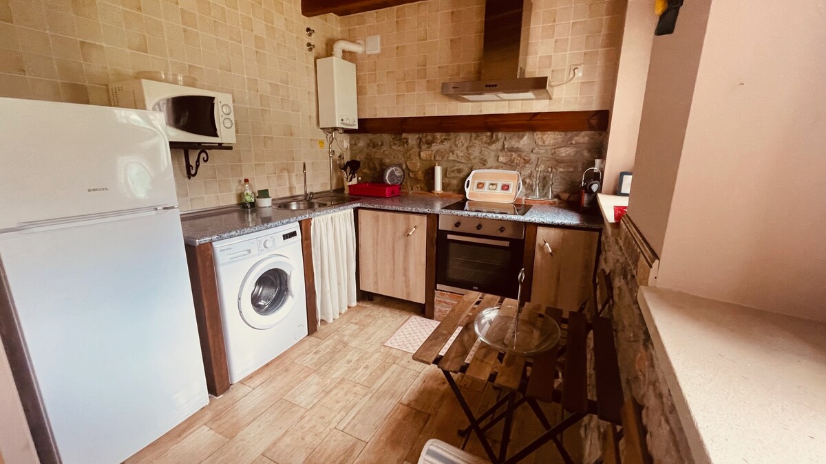 A 75 m2 house distributed over three levels and featuring a separate kitchen, a dining room, a living room with a fireplace, and two bedrooms with an en-suite bathroom. It is an old building that has been completely renovated and equipped with a ceramic stovetop, oven, microwave, washing machine, dishwasher, refrigerator, small appliances, dishes, bed linens, and towels. It has a closed patio with access from the kitchen to relax or eat outside and a balcony overlooking the street.