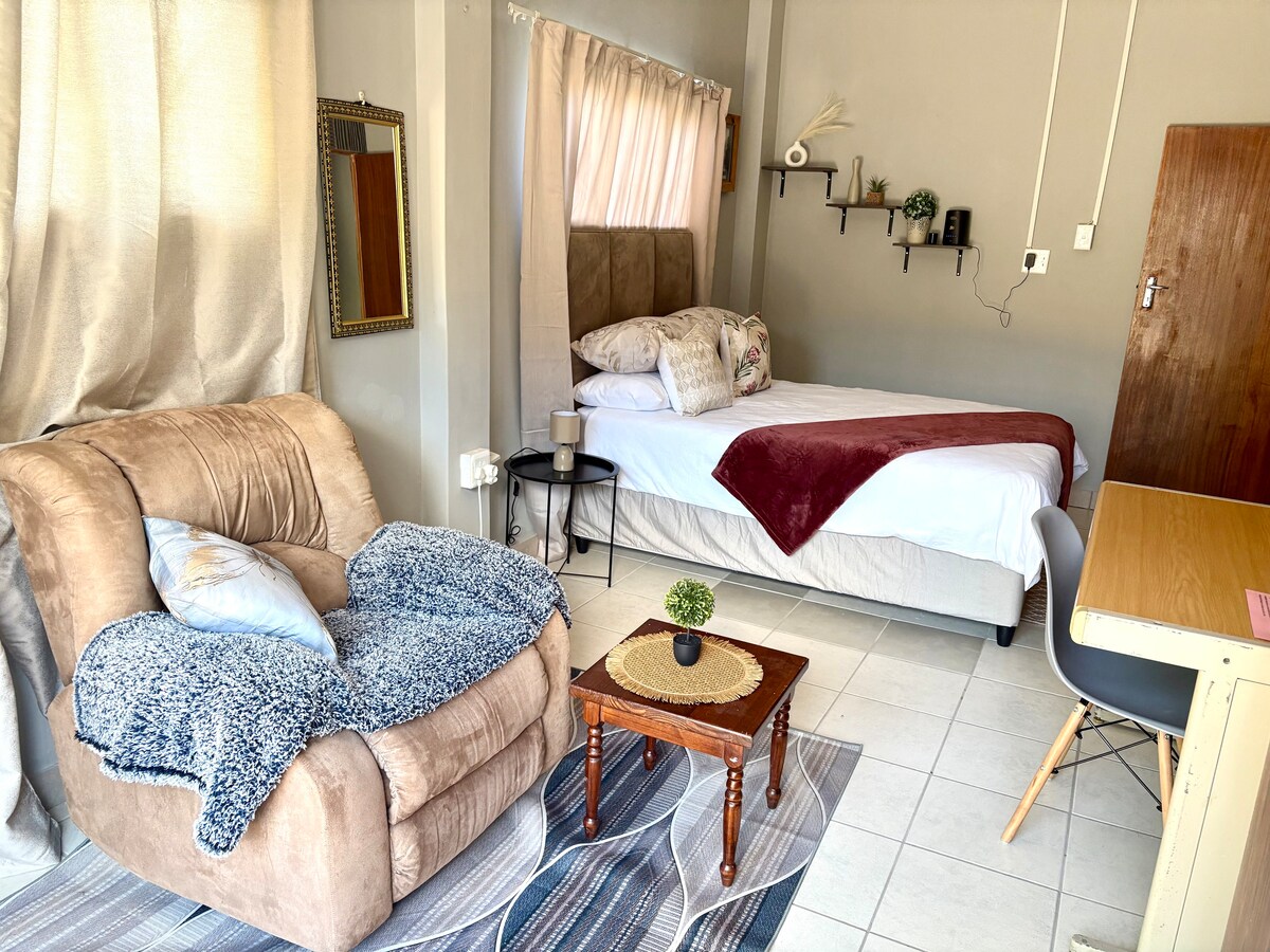 NO SMOKING INSIDE,PLEASE. This is an open plan self-catering unit with it’s own entrance. It is light, airy and is pleasantly decorated. It has a separate toilet, hand basin with a shower above the bath. The kitchen is fully equipped with gas stove, microwave, fridge/freezer, washing machine, kettle, toaster, cutlery, crockery, pots, pans and all utensils. There is a small working space and constant wifi is available. There is also secure off road parking. SOLAR POWERED!! No more load shedding