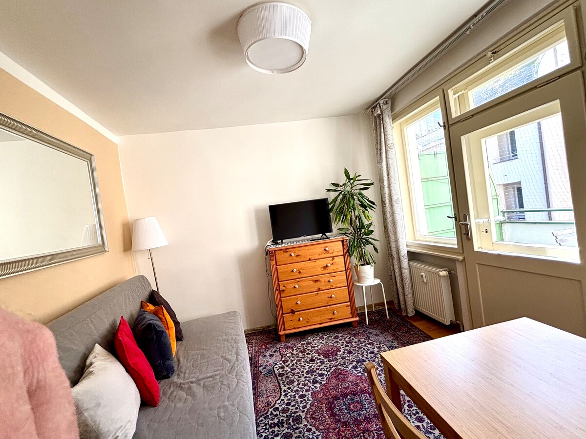 ★ Comfy Bedroom and Huge Balcony ★ Up to 4 Guests ★ Next to Main Railway Station ★ Great Espresso ★ Netflix TV ★ High Speed WiFi ★ Washer ★ Take a rest in bright, comfy nest with huge balcony. Top (5th) floor of centrally located building with no elevator, quiet romantic place. Good choice for both experienced travellers and occasional tourists. Next to main station, airport 30 mins, Old Town attractions, shopping places within 5 mins walk. Netflix TV, high speed WiFi, washer, nice kitchen.