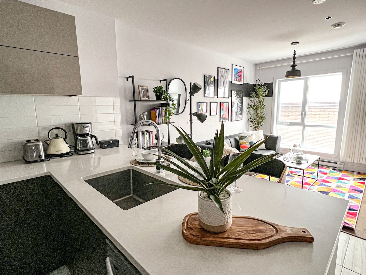 Plaza10 is a modern and stylish single bedroom apartment located in the heart of Rosemont la Petite Patrie (a borough 1 hour walk North or a 15 min public transit ride from downtown Montreal). It’s an area full of restaurants, cafés, shopping and entertainment, making it the ideal place to stay while exploring Montreal. The closest subway station is a 6 min walk away. The space features a fully-equipped kitchens, private terrace, heated radiant floors, electric fireplace in living room & bedroom