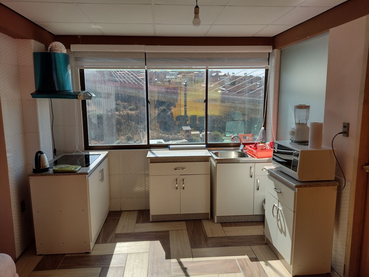 Relax in this unique and quiet getaway. Fully equipped INDEPENDENT apartment with an excellent view and nearby green spaces. 15 minutes from downtown La Paz, with full transportation connectivity. 10 minutes from the Red cable car. Quiet and safe neighborhood. Good Internet connection 🛜