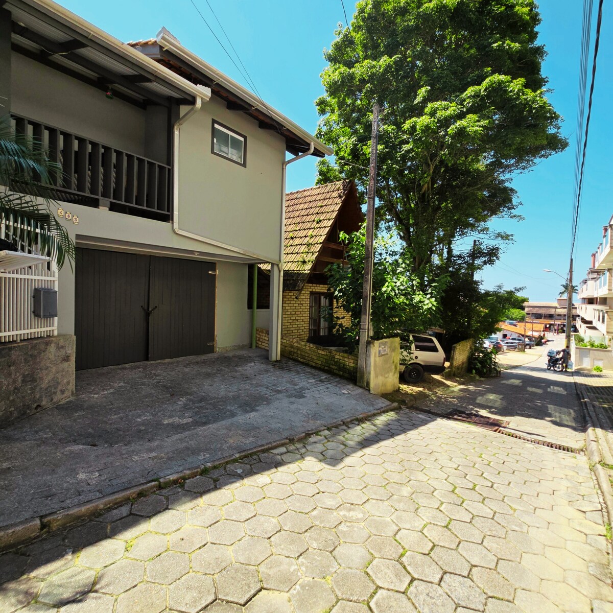 Cozy house with rustic style 5 minutes from Bombas Beach. Excellent for people who work remotely (home office) and want to be close to nature. It has 2 parking spaces with an electronic gate, Wi-Fi, air-conditioning and a full kitchen. Quiet and well-located street, close to markets, pharmacy and restaurants. The house shares the land with another house, where we rent rooms. However, each house has its own entrance and an exclusive patio. It has a shared laundry area.