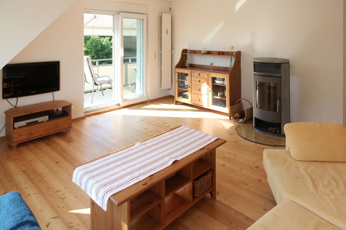 The apartment is located in the upper floor of a three-party house in a quiet Godesberg altitude and extends over 2 floors. It is bright and spacious. The view is stunning and goes into the green and the Seven Mountains. The existing balcony to South is accessible from the living room and kitchen. Living at the groundfloor we are happy to assist you to make you stay as convenient as possible! The apartment is fully equipped and has a large living room with panoramic views, kitchen and bathroom. Two double bedrooms are on the same level, the third bedroom is on the upper level accessible via a space-saving staircase. It has a double bed and a work area with desk. Parking space is available directly in front of the house on the street. The connections with the B9 and the infrastructure of the Bonn area is excellent. The Cologne-Bonn Airport can be reached in 25 minutes by highway. The apartment is a great base for exploring the local sights of Cogne-Bonn area and the romantic Rhine Valley with Rolandsbogen, Loreley and the Seven Hills. Muffendorf is a very picturesque part of Bonn-Bad Godesberg. There are many half-timbered houses in the old town along the main road and in many places that have preserved their originality. You have a good view of the Seven Mountains with Drachenfels etc. on the opposite side of the Rhine. There are two exquisite restaurants and two pubs to explore in walking distance as well as the Café de Muffendorf that Thursdays - Sundays also offers fresh baked goods. The nearest supermarket is open Monday - Saturday until 22.00. Bad Godesberg, which was considered a diplomatic district in the time of the Bonn Republic, consists of many parks and the Rhine promenade, from where you can let the picturesque backdrop of the Seven Mountains with the Drachenfels and Petersberg effect on you. A ferry brings you on the other side of the Rhine, on which there are many hiking trails such as the Rheinhöhenweg. Bad Godesberg itself is dominated by the Godesburg watching over our little town. The mineral springs at Bad Godesberg Draitschbrunnen and the town hall offer her healing water on even today. The apartment is very well connected to public transport, the next bus stop is only 50 m away and there are only two bus stops to the subway Stadthalle Bad Godesberg away (15 min walking distance). The Bad Godesberg Train Station can be reached by walking in 20 minutes, by train you are then in 5 minutes in the center of Bonn or in half an hour in Cologne. Metro and train station are easily accessible by bus. International guests are welcome!