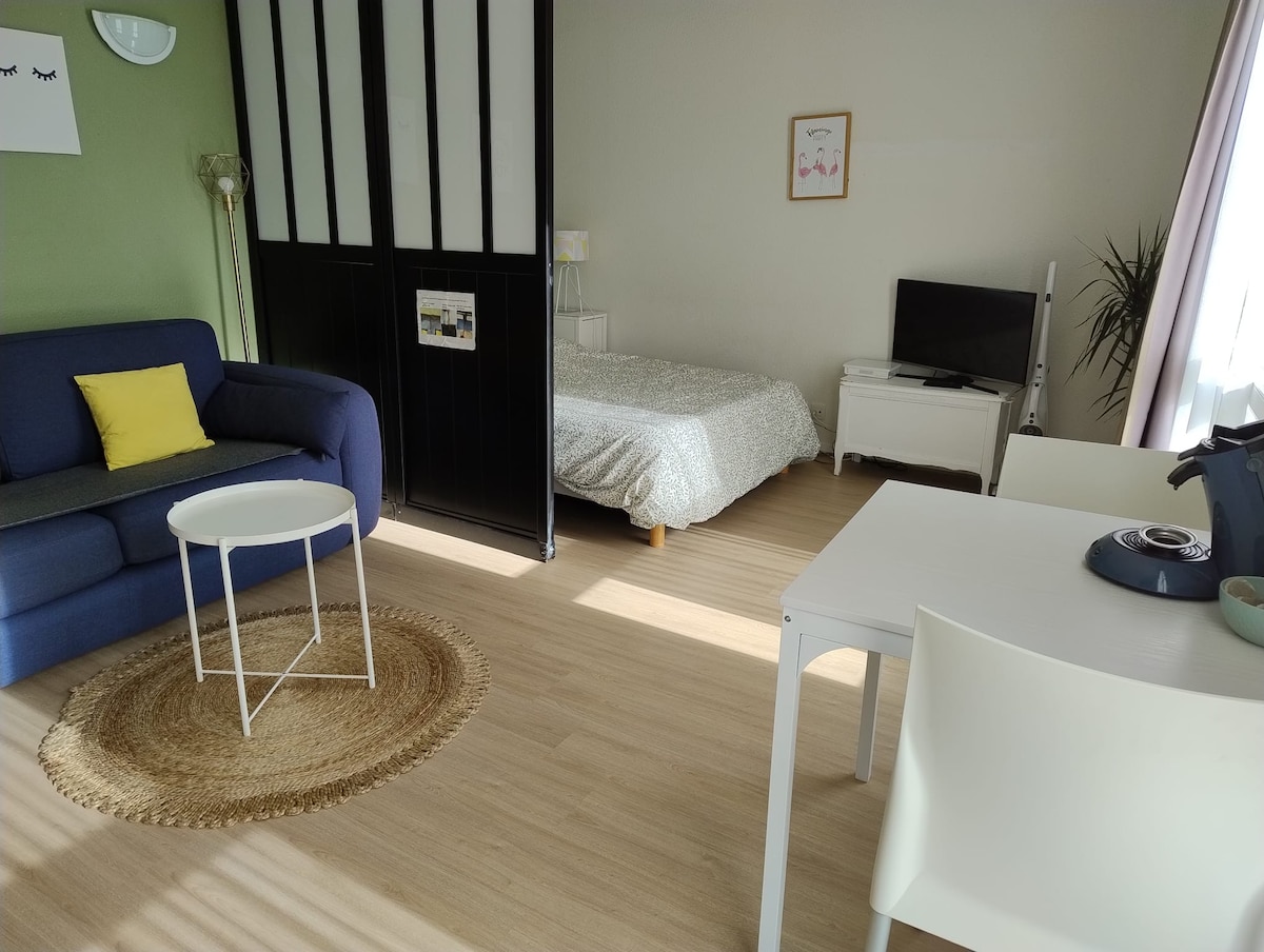 Appartment of 33m2, which you will appreciate for the district and calm. Perfect for couples and families. Close to the trolley. Renovate and non-smoking apartment, accommodating 4 travelers. 1 bed (140 cm) and a small sofa that can be turned into a bed (132 cm) Close to supermarket and bakery (100m) Tea, coffee available Pool access from June 15th to September 15th. Welcome to our house :)