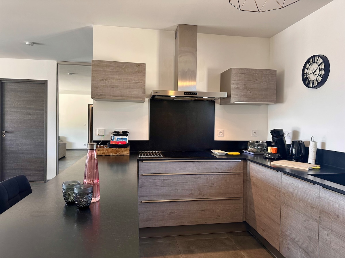 Nice 41 m2 2-bedroom apartment in a recent residence. Contemporary style decoration A 10 m2 outdoor terrace. Reversible air conditioning in the rooms. A few steps from the apartment, you will have a supermarket, a tobacco shop, a pharmacy, a bakery, restaurants... A central location allowing you to be connected to major cities by the road axis (RN). Train station 2 km away. The cleaning must be done at the end of the stay No smoking. Linen rental is extra.