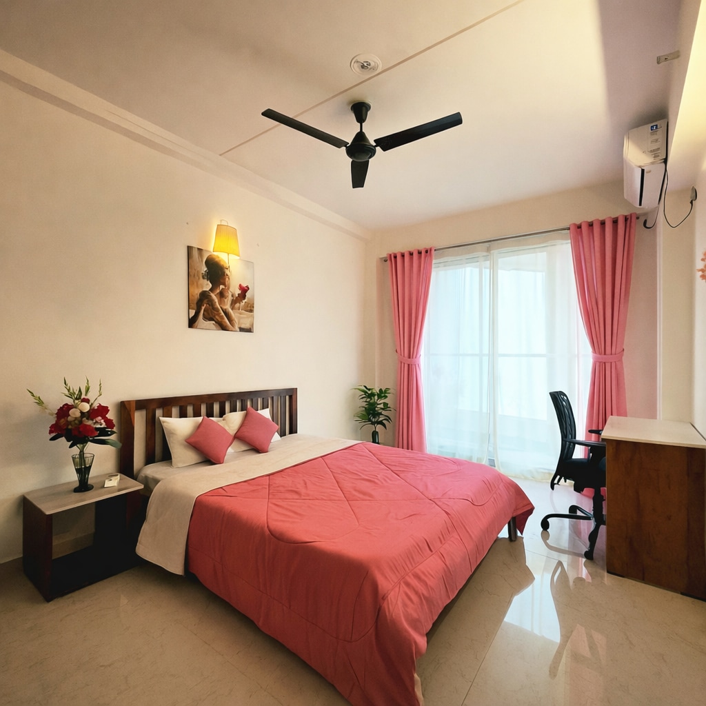The flat is located in a residential building within a green zone. It offers a peaceful & quiet environment with no disturbances. Bedroom is air-conditioned & comes with various amenities, as shown in the pictures. Additional features include Wi-Fi, a smart TV, a furnished kitchen with LPG gas, and hot and cold water. flat is spacious & well-ventilated. Pls note that ID proof is mandatory, & visitors r not allowed. Accommodation is only available to Indian citizens; no foreigners are permitted.