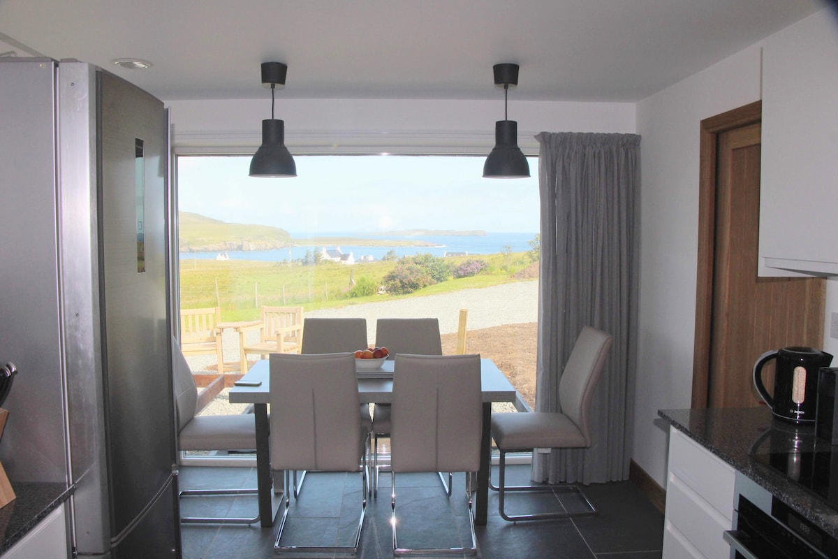 Beams, Geary is a cosy renovated house located in the Waternish Peninsula of North West Skye. Beams is the perfect house for all couples, families and friends, offering spectacular panoramic views. EV Charger also available! Guests can take advantage of an open-plan kitchen, dining and living areas, and a comfortable Main Bedroom. The upstairs open mezzanine has two single beds. A second small bathroom with shower can also be found within the property.