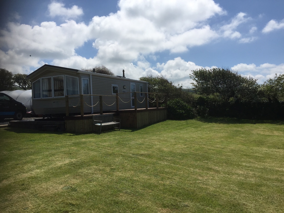 In Boscastle this Very spacious and comfortable open planned mobile home set in private gardens with superb sea views. Fully equipped kitchen,gas cooker,fridge/freezer and microwave. Double with king bed, one twin room. Shower room. Lounge and dining area with tele, free wi fi .All linen and towels are supplied with all necessary essentials, wash up liquid, t towels,j cloth etc Welcome pack, wine,,tea,coffee,milk.Outside decking area with table and chairs,sunbeds BBQ. Fire pit provided.