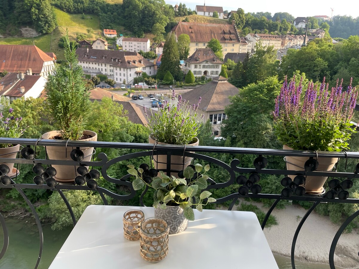 Charming studio located in the heart of Fribourg's old town with stunning views of the Sarine. It consists of a large double bed, a bathroom with shower, a kitchenette and a small balcony. Accommodation for 1 or 2 people, independent, 24 m2, in a family home. We provide you with bedding, towels and a washing and drying machine. Cleaning is done once a week, non-smoking apartment and not suitable for animals.