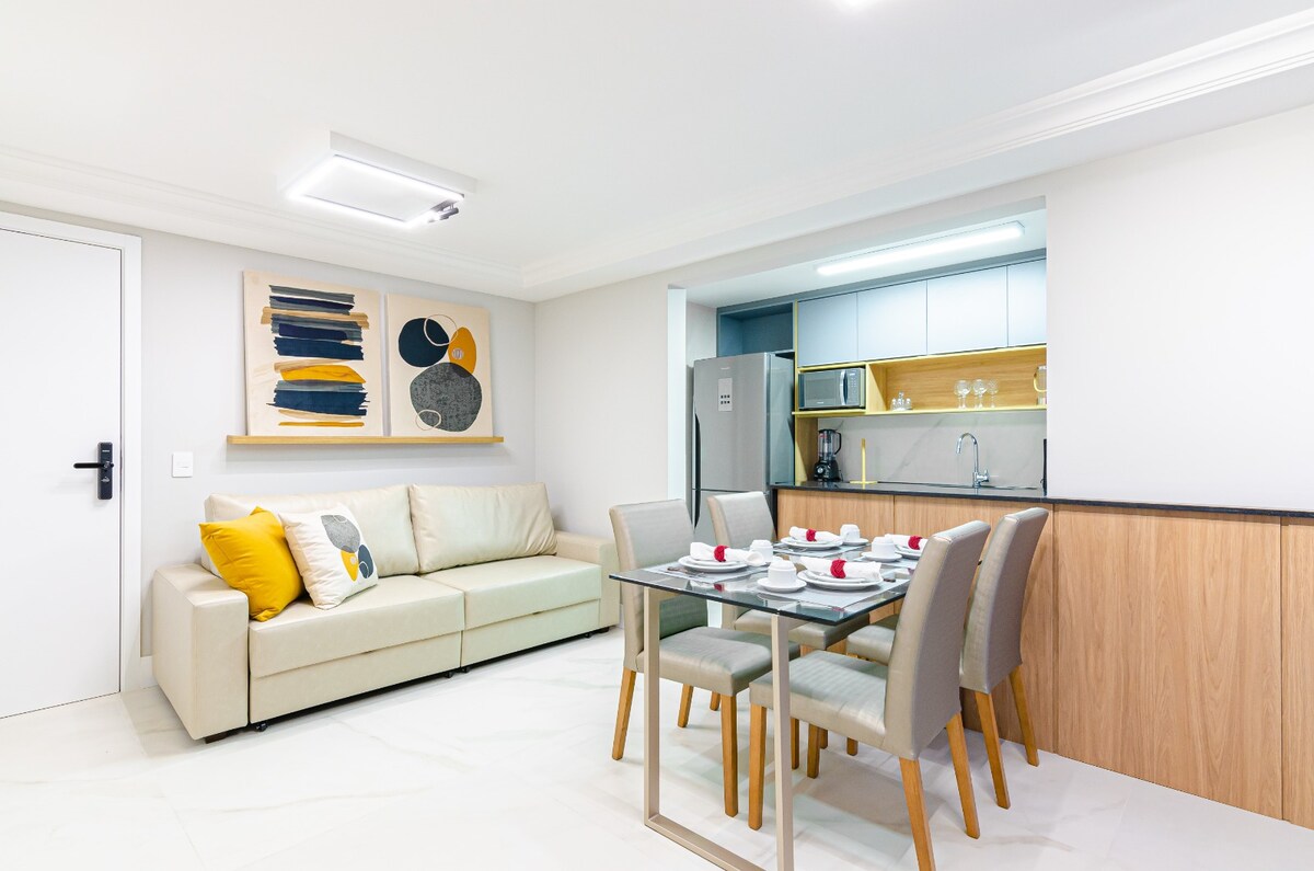 Modern studio, brand new, cozy, perfect location, with a beautiful view from the balcony, especially at night. Fast Wi-Fi, work desk, 55” smart TV, queen bed. Air-conditioning (hot/cold). A washer and dryer and a beautiful island in the kitchen. 50m2 of great style - 27th floor, Quiet. In the Center/Batel, close to shops, banks, malls, gastronomic center and Hospital. In the building: Swimming pool, fitness center, game room, sauna, Jacuzzi, 24-hour concierge.