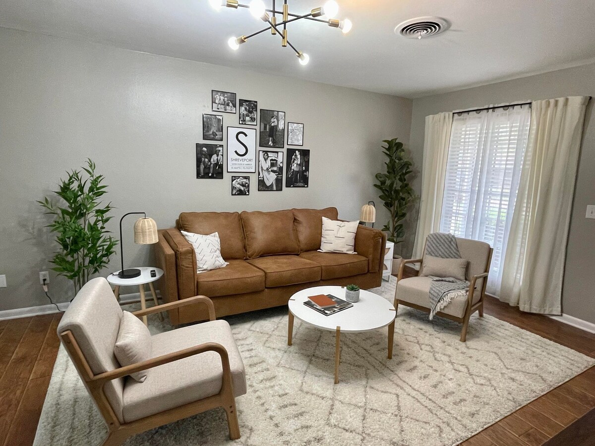 This newly renovated 2000 sq ft home is perfect for a vacation getaway . Guests can lounge by the large brick fireplace with a cup of coffee (from our specialty coffee bar), or head to the back patio to toast smores by the firepit. It sits on a corner lot with mature pecan trees and features a fabulous open concept kitchen/living area. It's 5 blocks from Shreveport’s most upscale shopping /restaurants-2 miles from Brookshires Arena. Great for family trip/business trip/weddings guests-