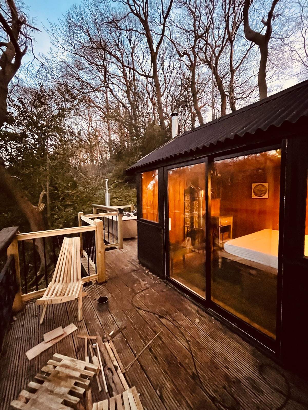 The Pines Treehouse is nestled underneath a huge oak tree sitting high above the running water of Sand Beck. Nature cocoons you and you can reach out and touch the trees, see wildlife all around you amongst the pines. With breathtaking views through the tress and across the valley you are completely private having no other accommodation on the site making this a truly unique and special experience. A great effort has gone into creating this space to allow you to simply relax and reset in nature.