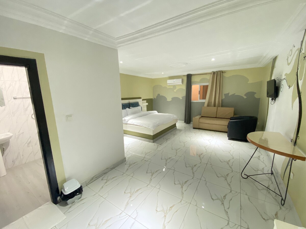 Nous vous offrons un cadre paisible pour votre repos, vos affaires ou d'autres activités. Nous mettons une grande chambre climatisée à votre disposition avec une cuisine américaine équipée qui donne sur un grand salon lustré. Venez profitez du glamour de cet endroit élégant et haut de gamme.