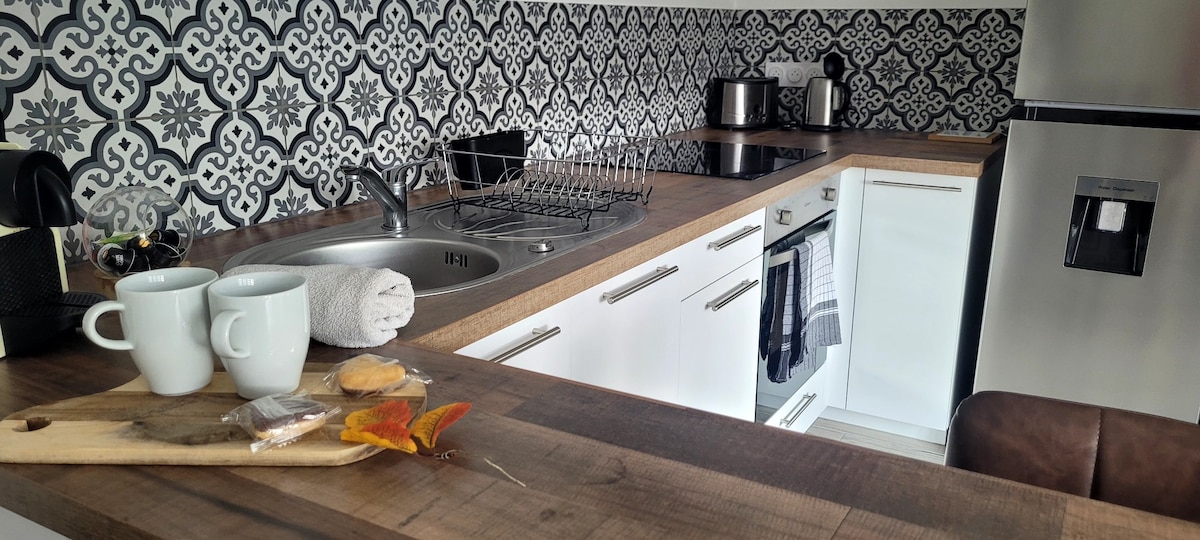 ZEN COTTAGE.... Details of rooms: total area: 42m2 A beautiful fully equipped kitchen (1 table + 2 chairs, 1 fridge, microwave oven, electric hob, 1 coffee maker, more kitchenware) The kitchen is opened on the living room and on a glass door giving on a terrace of 18 m2 with a table of garden + parasol for 2 people, 2 chairs and barbecue. 1 living room including a sofa bed + coffee table. A nice bathroom with shower, sink / mirror, and 1WC.