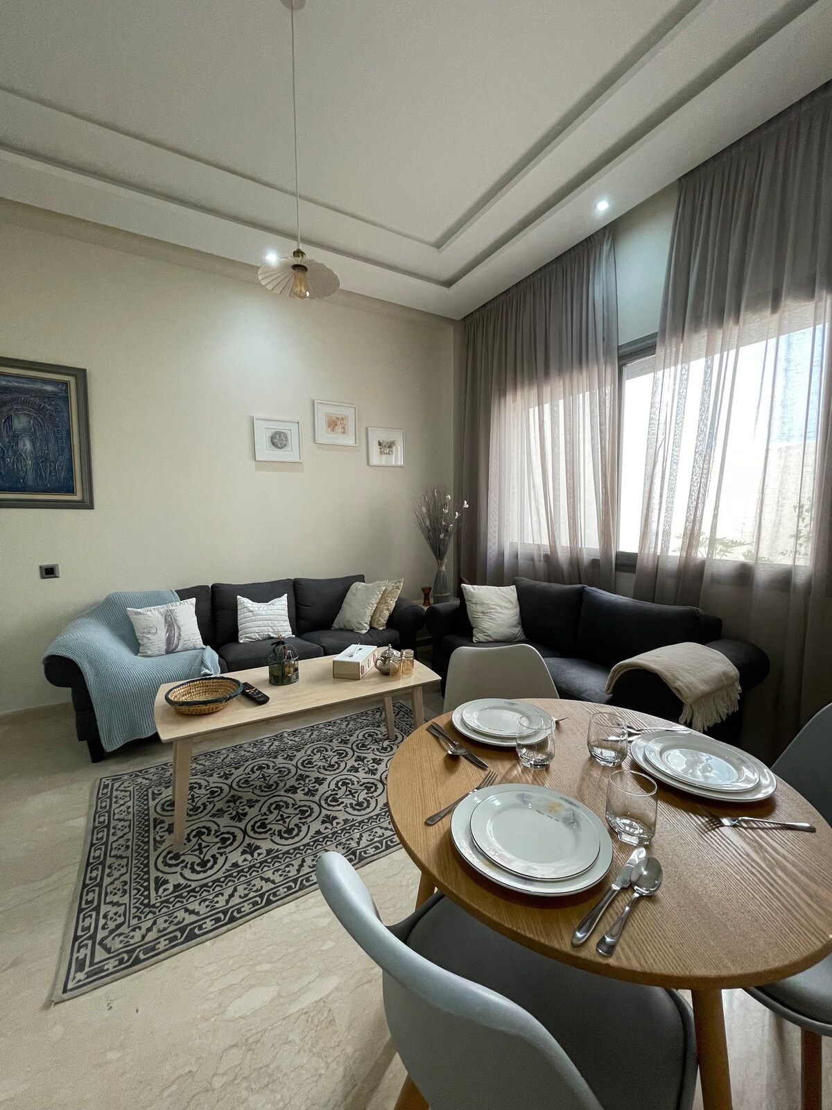 L'appartement au 7ème étage très lumineux ensoleillé,décoré et aménagé avec soin. Le séjour cosy donne sur la jolie terrasse ensoleillée sans vis à vis. commerces de proximité, SPA,salons de coiffure et restaurants à proximité de l'immeuble : Carrefour Market à 250m, Tour Casa Finance City CFC à 2 km. Le quartier commerçant du Maarif et Twin Center. Merci d éteindre la climatisation si les fenêtres sont ouvertes, en votre absence et la nuit