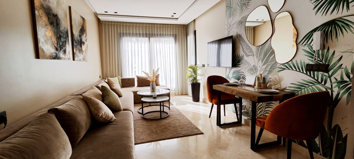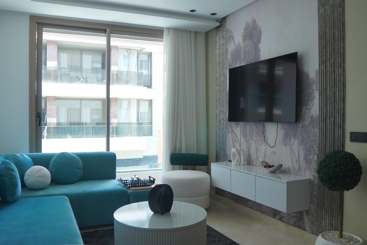Perla 403 💎, a haven of peace where the elegance of a modern residence is combined with the comfort of 5-star hotels in the heart of Casablanca! Relax in a spacious living room with a modern design, equipped with a 55" Smart TV with Netflix and IPTV for evenings of absolute relaxation. The bedroom, a real cozy nest, promises peaceful and restful nights ☁️ From your private balcony, admire the splendid sunsets over the city, making every moment of your stay unforgettable! ✨
