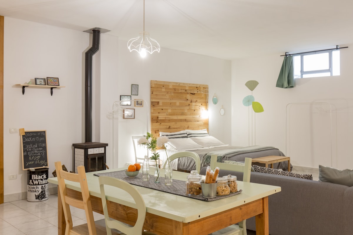 Contemporary Boutique B&B in VALPOLICELLA, in an ancient stone house with two elegant minilofts overlooking the valley, a big GARDEN full of secluded spots surrounded by vineyards with an outdoor WHIRLPOOL to use privately for 2 hours/day (only May-Sept because not heated). ECOLOGICAL geothermal system for heating/cooling and solar panels for hot water. The food needed for breakfast to prepare in the suite is included. 20 mins from Verona, 30 from Lake Garda, 25 from the airport.