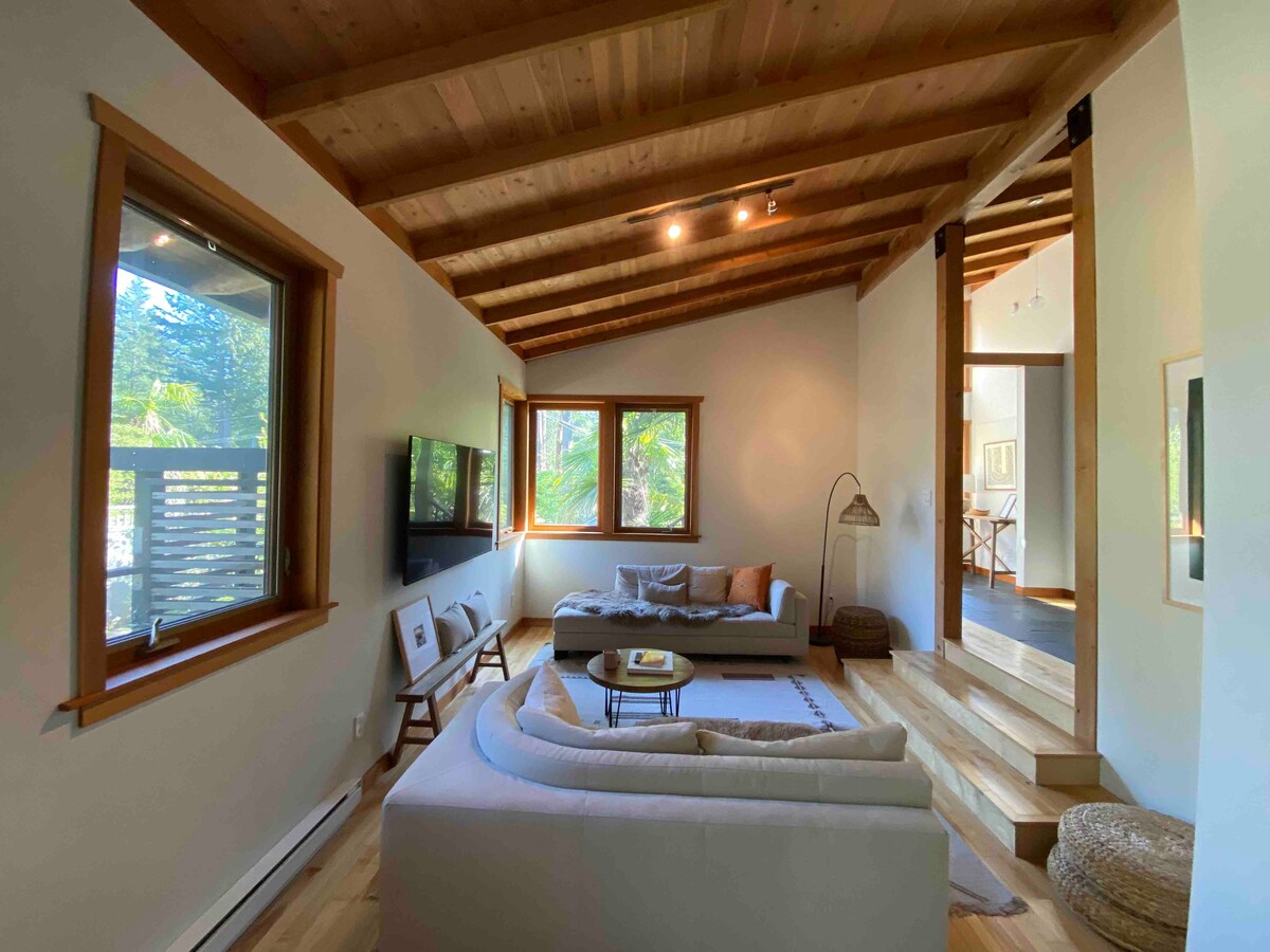 Just a short, flat walk from the ferry in Snug Cove, the Palm Retreat House is a calm, beautifully remade island sanctuary where thoughtful design and attention to detail meets effortless comfort and convenience. Centrally located near Bowen Island's Snug Cove, and yet serene, this luxury two-bedroom home invites you to slow down, connect with nature, and discover the islands coasts, trails, and village at your own pace.