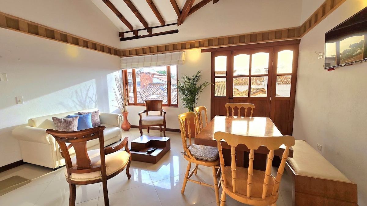 Spectacular apartment equipped with incredible tasteful details. A place with an unparalleled location in Villa de Leyva. Just steps from Plaza Mayor, it is close to all points of interest such as museums, restaurants and parks. The place is spotless. Features TV, WiFi, bathrooms with hot water. It has a beautiful balcony to enjoy beautiful views. A quiet place to rest. This place is family-friendly. Only family groups are accepted.