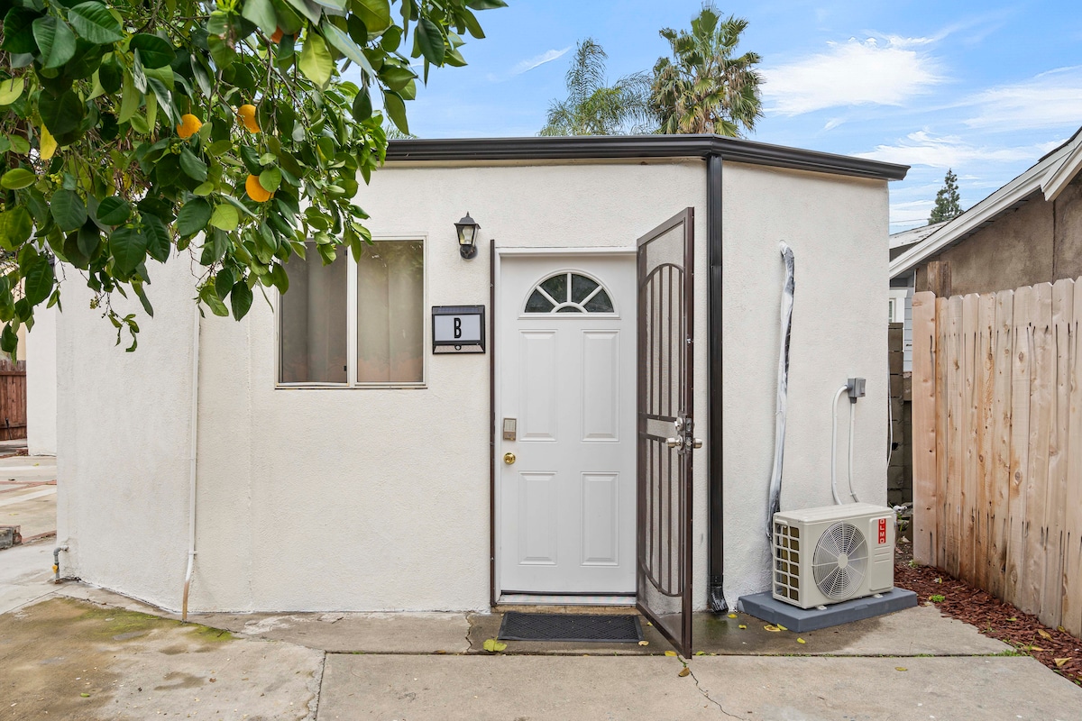 Chic studio guesthouse in central Burbank with king-size bed, smart TV and fully equipped kitchen. Work comfortably at the desk with high-speed Wi-Fi, then unwind on your private patio with lounge seating. Self check-in via smart lock, free street parking and air conditioning included. Walk to Warner Bros and Disney studios, Johnny Carson Park and cafés; downtown LA just minutes away. Perfect for couples, solo travelers and business guests seeking a quiet retreat near studios.