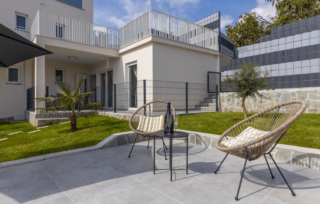 The apartment is situated close Opatija city center, only a few minutes away by car or an eight minutes walk. It consists of a living room, bedroom, a dining room, two bathrooms, kitchen, sauna, open space lounge, terrace, a surrounding garden and a car parking. Thanks to the fact of being in the ground floor with a surrounding garden you have the sensation of renting a house and not an apartment.