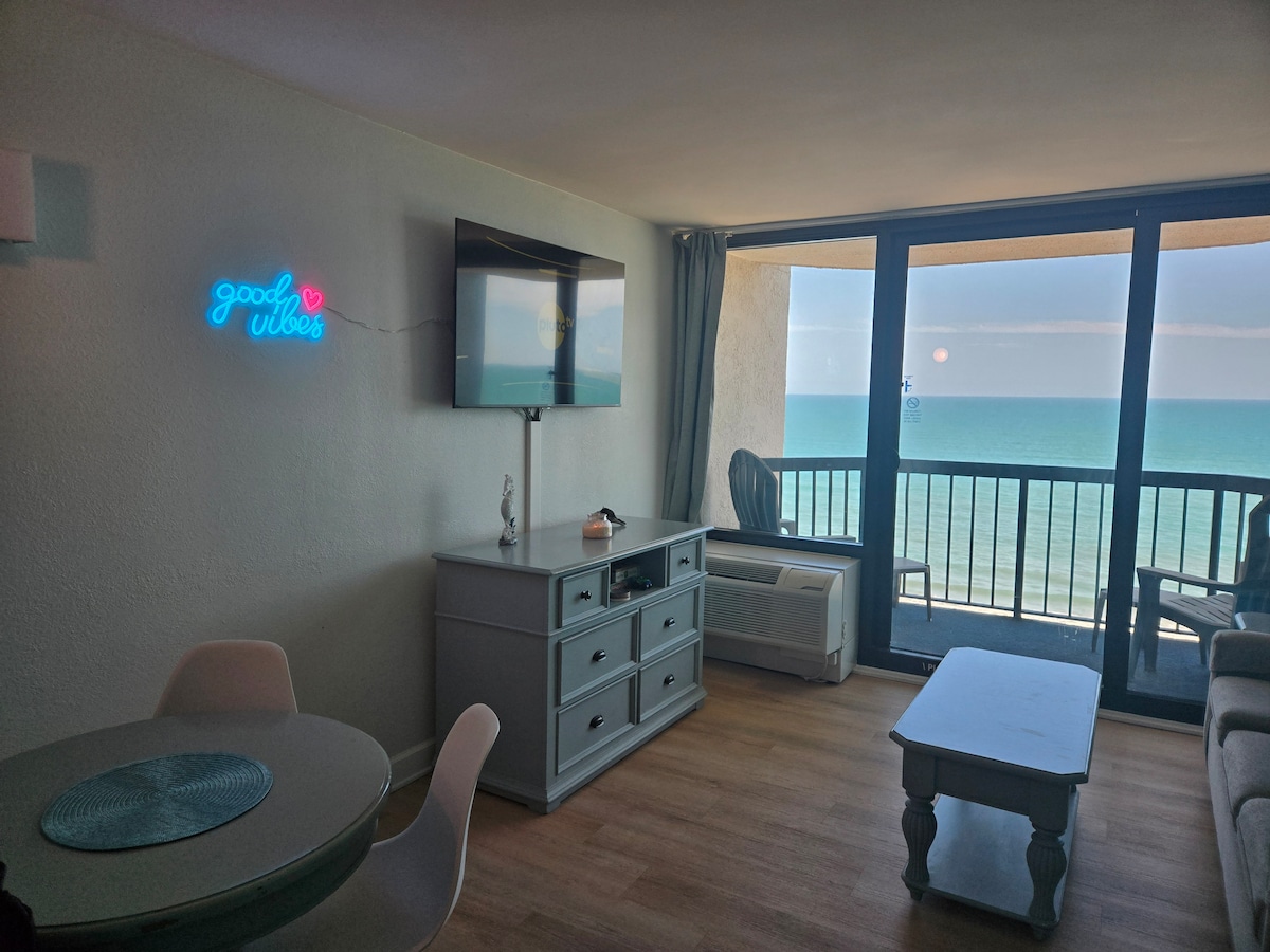 This Beautiful 1BR, 1BA Oceanfront Suite, sleeps 5 and is very spacious. 1st floor with private balcony and stunning Oceanfront view. 1Br with King bed, living room has a pull down murphy and sofa sleeper. Granite counters in both kitchen & bath with a large shower and full efficiency kitchen. 2 TV's, wifi, Iron, blow dryer, 2 pools indoor/outdoor, 2 Jacuzzi's indoor/outdoor, lazy river, lawn chairs/umbrellas and a quick walk to the beach. Ask about our honeymoon/anniversary packages we offer.